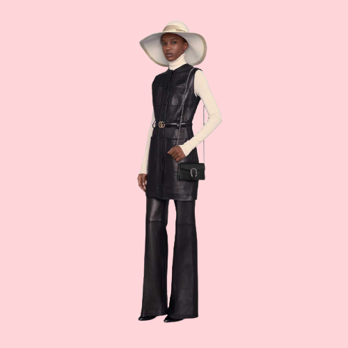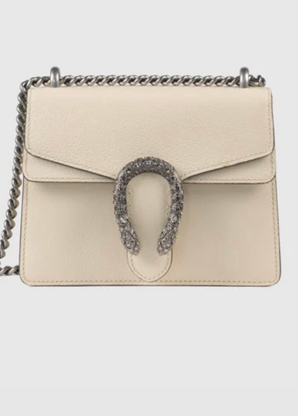 A structured leather chain super mini bag with a key ring that can be used to attach this bag to a separate larger bag. The closure has the textured tiger head spur closure-a unique detail referencing the Greek god Dionysus, who in myth is said to have crossed the river Tigris on a tiger sent to him by Zeus. The tiger head closure is enriched with crystal stones. Made in resistant textured leather.